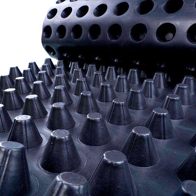 Principe de fonctionnement du panneau de drainage : le géotextile qui le recouvre agit comme un filtre, laissant passer l'eau tout en bloquant les sédiments. La structure concave et convexe de la plaque de drainage forme un filtre à eau sur sa partie supérieure, qui évacue l'eau par les trous, tandis que la partie surélevée retient l'eau et ralentit la perte d'eau du sol.
